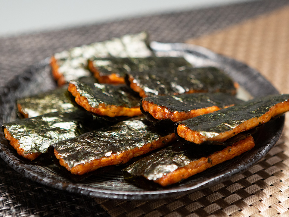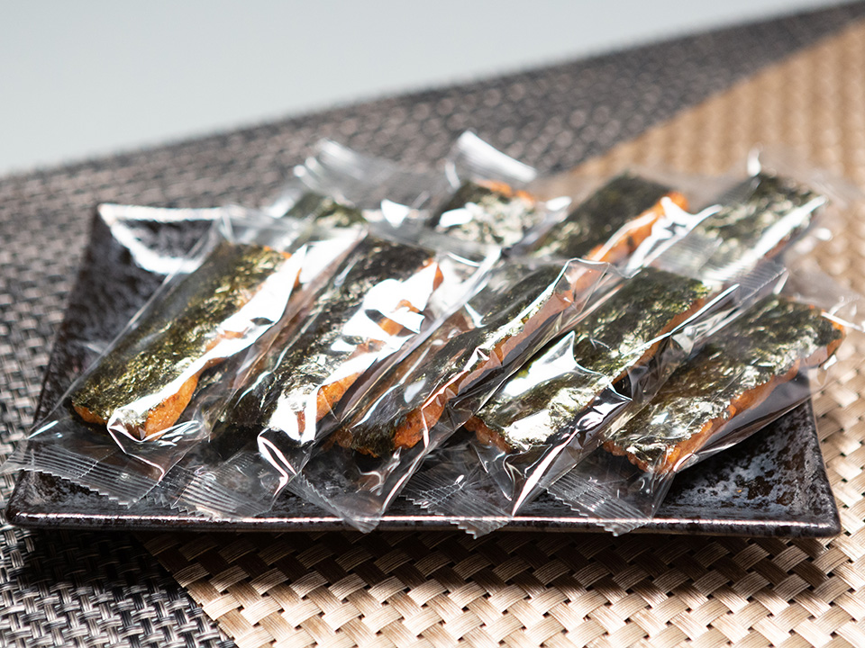 特製の醤油おかきに焼き海苔を手巻きしました。